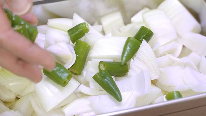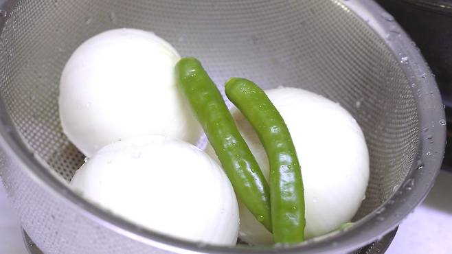 청양고추도 꼭지를 제거한 후 깨끗이 씻어 양파와 함께 물기를 꼭 제거해 주세요.