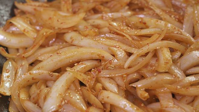 맛은 제육볶음에 있는 양파 맛과 비슷해요. 그래서 밥과 함께 다른 반찬 없이 비벼 먹어도 참 맛있게 먹을 수 있답니다.