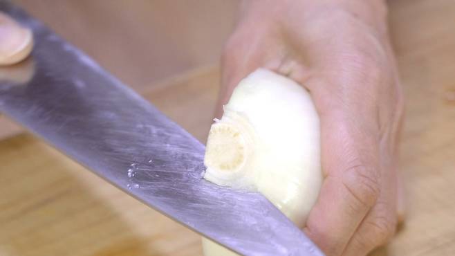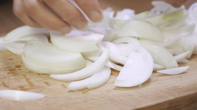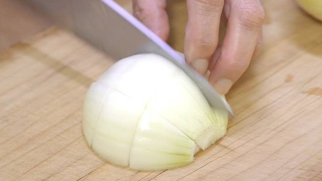 양파는 절반으로 자르고 심지를 제거하세요. 심지를 제거해야 양파를 분리할 때 보다 편하게 할 수 있어요. 그리고 칼집을 가로 세로로 2번씩 내어 자르면 한입에 넣기 편한 크기로 자를 수 있어요.