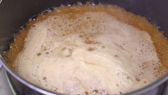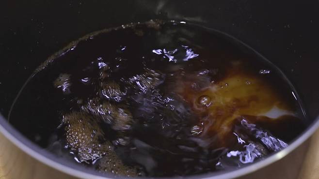 계속 저어가며 설탕을 녹이고, '강불'에서 팔팔 끓을 때까지 끓이세요. 양념장 물이 팔팔 끓으면 바로 불을 끄세요.