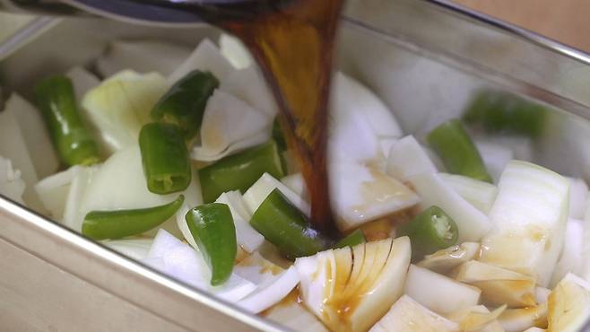 그리고 양념장 물이 뜨거울 때 바로 양파에 부어 주면 된답니다.