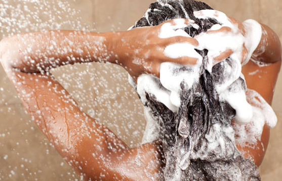 샴푸로 머리를 감는다.