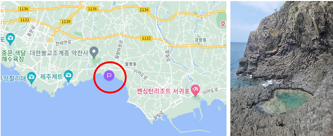 주소 -제주특별자치도 서귀포시 하원동 1644, 약천사 건너편 방향에서 진입 후 해안선 위를 따라 우측으로 500m 정도 이동