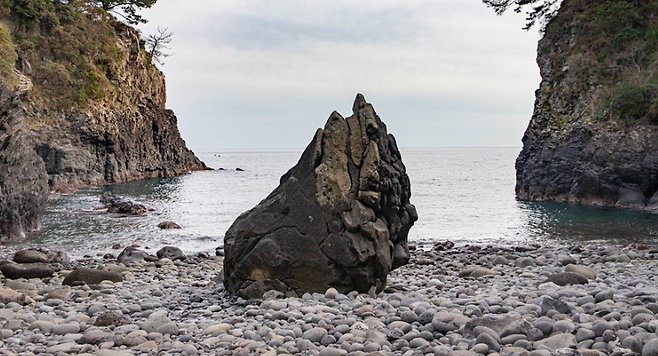 10분 정도 내려가다 보면 바위 병풍 사이로 펼쳐진 바다와 몽돌, 그리고 가운데 우뚝 솟은 바위를 볼 수 있는데요. 바위는 물개를 닮아 '물개바위'라고도 불린답니다. 이곳이 바로 진곶내의 포토스팟이라는 점. 사람들의 발길이 닿지 않는 곳이었는데 최근데 사람들이 위치를 공개하자 관광객들이 많이 찾고 있습니다.