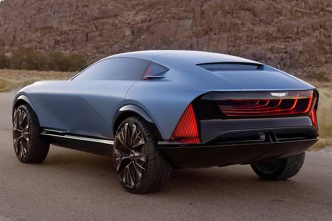 외관 디자인은 4인승 쿠페형 크로스오버의 비율을 기반으로 하여 매우 대담한 실루엣과 역동적인 전면 디자인을 자랑합니다. 24인치 대형 휠과 높아진 차체는 사막과 같은 험준한 지형은 물론, 일반 온로드에서도 세련되고 고급스러운 주행감을 동시에 구현할 수 있도록 설계되었습니다. 이는 어떤 환경에서도 최상의 드라이빙 경험을 제공하겠다는 캐딜락의 의지를 보여줍니다.