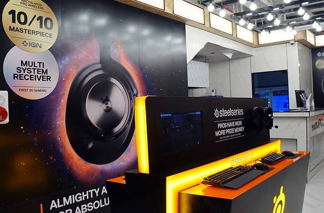 또한 스틸시리즈와의 협업은 지속적으로 이어지는 것이기 때문에, 신제품이 나오면 체험존도 계속 바뀔 예정이라고 합니다. 현재는 스틸시리즈 게이밍 헤드셋 노바 프로를 입구 부근에서 체험할 수 있는데, 이 헤드셋에는 AI 노이즈 캔슬링 기능이 들어가 있어서 음성 채팅에도 키보드 소리가 전송되지 않는다고 하네요. 지하로 더 내려가면 세계에서 가장 빠른 스틸시리즈의 에이펙스 7 청축 키보드를 체험할 수 있죠. 최근에 주말에는 최소 500명 이상의 방문자가 스틸시리즈를 체험하고 간다고 합니다.