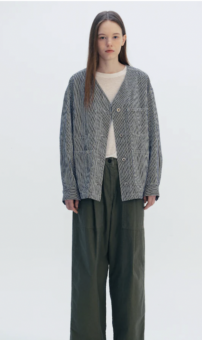 부드러운 착용감이 매력적인 노카라 워크 재킷입니다. 일본 Sunwell 사에서 수입한 쾌적한 면 소재를 사용하였습니다. 빈티지한 무드를 위해 브이넥과 함께 워싱 디자인하였고, 프랑스 작업복에서 영감을 받아 감성을 담아냈습니다. 민트 색상의 스티치 디테일로 스트라이프 패턴에 포인트를 더한 제품입니다. 심플한 룩과 조화롭게 어울려 포인트 아이템으로 활용하기 좋습니다.가격 -
