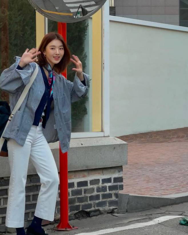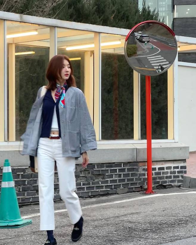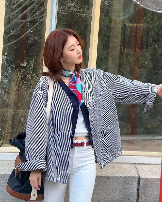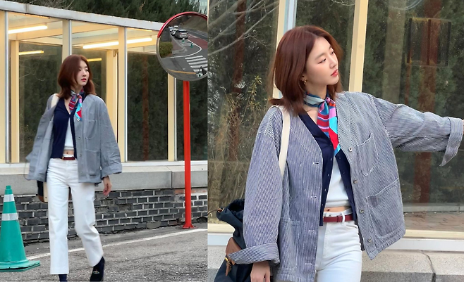 사진 속 장희진은 흰색 크롭티와 블랙 가디건을 이너로 입고 노카라 잔스트라이프 자켓과 흰색 팬츠를 입어 데일리룩을 선보였다.