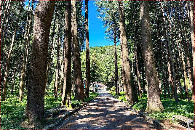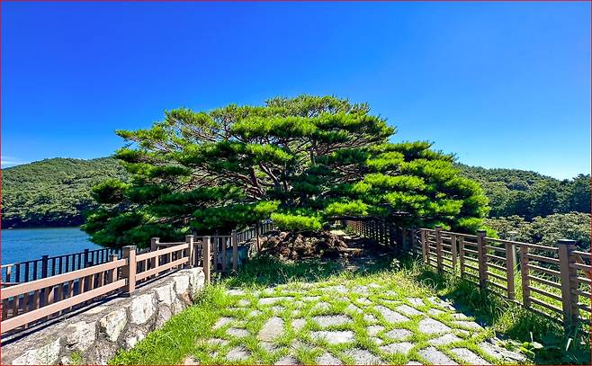 법기수원지의 산책로는 호수를 따라 부드럽게 이어집니다.걷다 보면 양옆으로는 편백나무와 측백나무, 개잎갈나무 같은 울창한 침엽수들이 병풍처럼 둘러싸고, 호수 위에는 고요한 물결과 반송나무의 자태가 반사되어 한 폭의 수묵화 같은 풍경을 만들어냅니다.