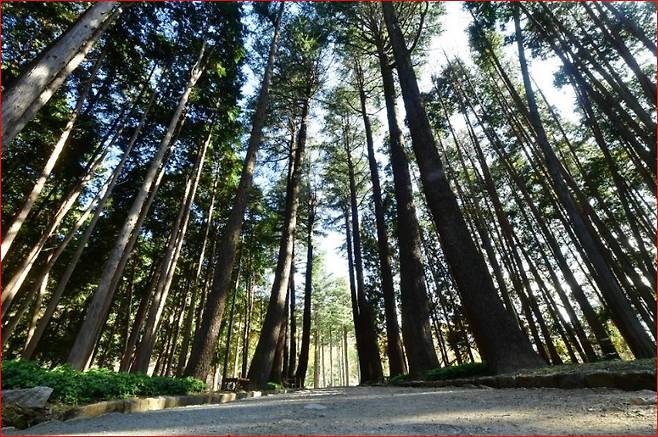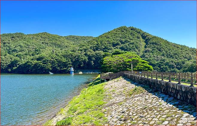 법기수원지의 산책로는 호수를 따라 부드럽게 이어집니다.걷다 보면 양옆으로는 편백나무와 측백나무, 개잎갈나무 같은 울창한 침엽수들이 병풍처럼 둘러싸고, 호수 위에는 고요한 물결과 반송나무의 자태가 반사되어 한 폭의 수묵화 같은 풍경을 만들어냅니다.