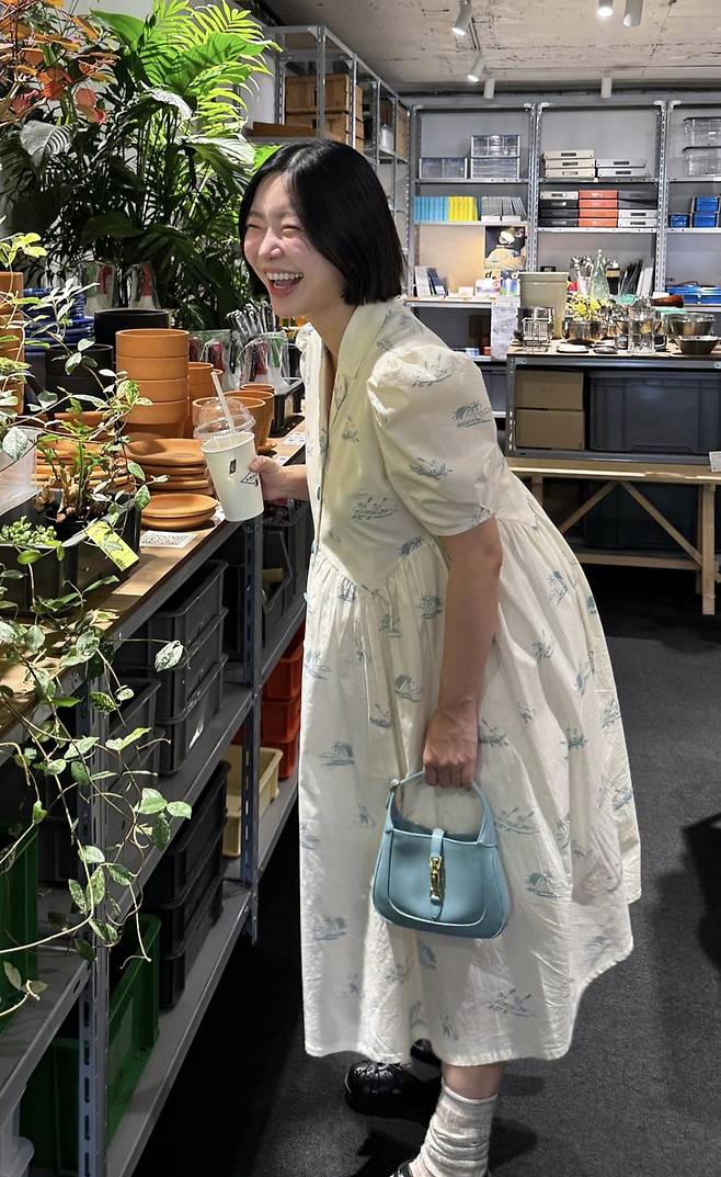 허리 스트링으로 라인을 조절해 부드럽게 떨어지는 핏은 체형의 변화를 자연스럽게 감싸줬고, 화이트 티셔츠와의 레이어드는 산뜻한 여름 분위기를 더했다.