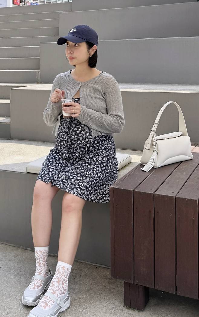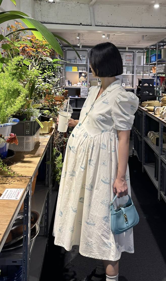 세 번째 패션은 아이보리톤 원피스에 하늘색 미니백을 매치해 청초한 매력을 강조했다. 퍼프 소매와 여유로운 플레어 실루엣은 임산부 특유의 편안함을 살리면서도, 특유의 우아함을 잃지 않았다.