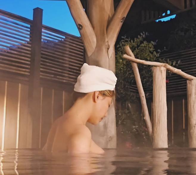 사진 속 그는 머리를 수건으로 감싼 채 온천에 몸을 담은 모습.