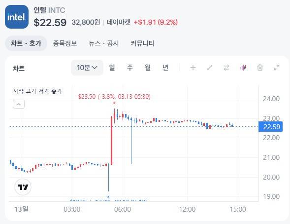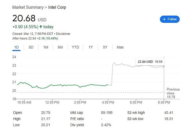 위와 같은 긍정적인 요인을 반영하듯 12일 20.68달러로 장을 마감했던 인텔의 주가는 데이마켓에서 약 9.1% 급등하였습니다.