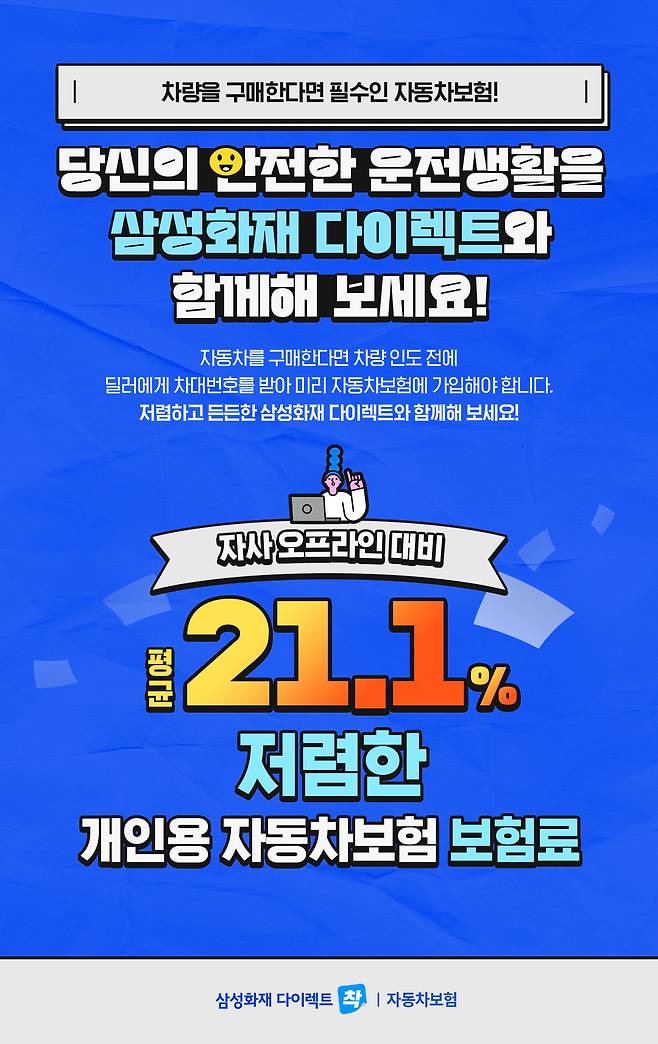 삼성화재 다이렉트 자동차보험에서는 인터넷으로 직접 가입할 경우, 자사 오프라인 대비 평균 21.1% 저렴하게 개인용 자동차보험을 가입하실 수 있는데요! 인터넷으로 직접 설계하고 가입해 판매 수수료까지 절감할 수 있습니다. 게다가 마일리지, 블랙박스, 자녀 할인 특약 등 다양한 할인 특약으로 추가 보험료 할인도 가능합니다. 인터넷으로 가입해도 삼성화재 보상서비스는 그대로 제공되고요!