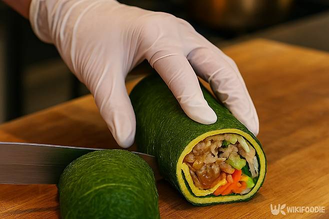 가장 먼저 소개된 음식은 메밀전병에 무채를 넣은 ‘빙떡’을 김밥 형태로 응용한 ‘빙떡 김밥’이다. 히밥은 묵은지의 새콤함과 메밀의 쫄깃함이 잘 어울린다고 말했다. 자신이 말아본 김밥을 맛본 뒤 “바로 팔아도 될 것 같다”고도 표현했다.