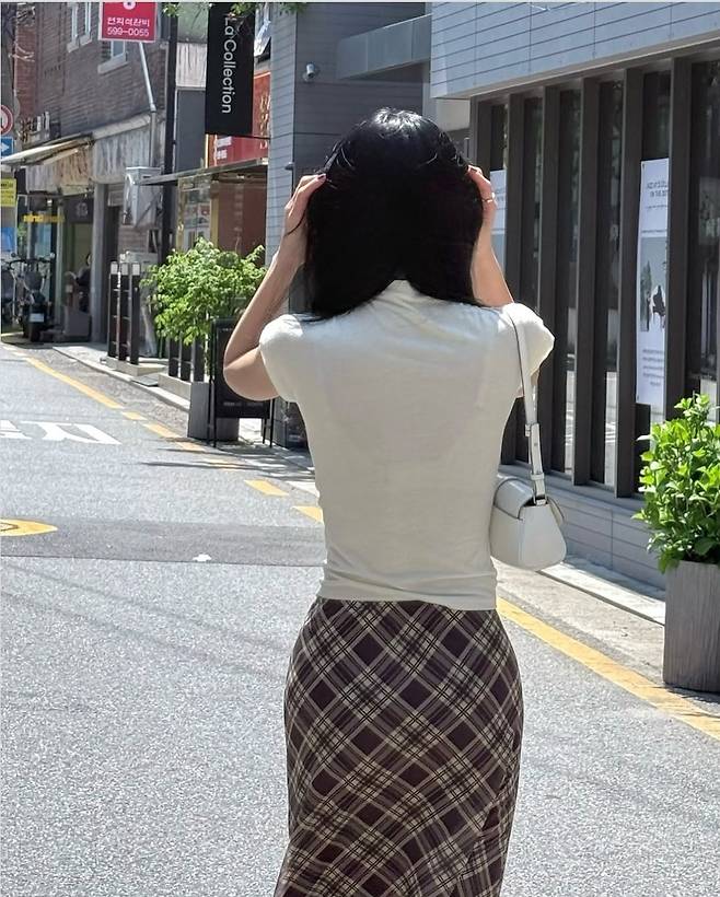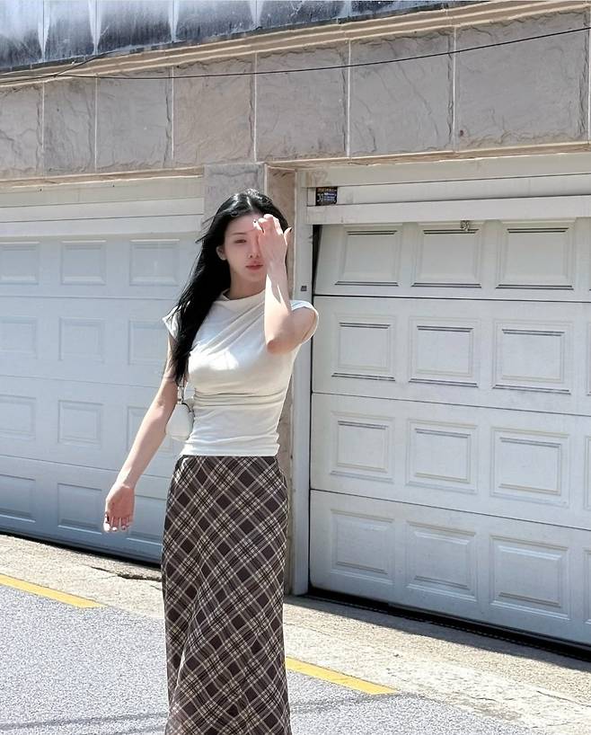 강다은은 크림빛 하이넥 슬림 티셔츠에 브라운 계열 체크 롱스커트를 매치해 우아하면서도 캐주얼한 무드를 완성했습니다.