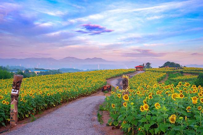 축제가 아니라도 하늘을 향해 고개를 든 큼직한 해바라기를 배경으로 사랑스러운 사진을 찍을 수 있습니다.