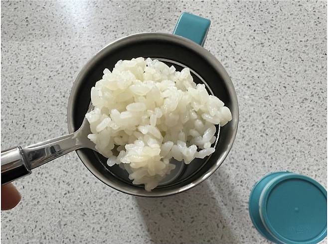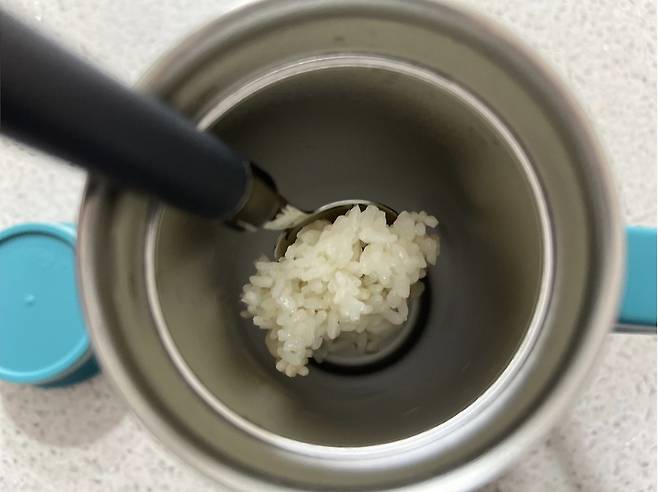 그다음 밥 한 숟가락을 텀블러에 넣어줍니다.