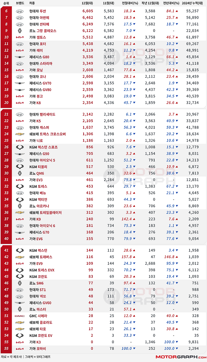 하이브리드에 이어 가솔린 터보까지 가세한 그랑 콜레오스는 6122대로 월간 9위에 오르며 실적을 이끌었다. 지난 11월 현대차 투싼, 아반떼, 그랜저 등의 부진으로 무려 5위까지 올랐으나 이들이 회복세를 보이며 판매량이 비슷함에도 순위는 떨어졌다.