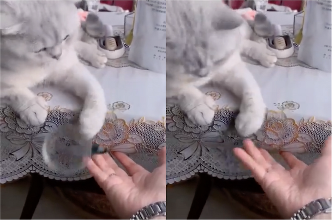 다행히 주인은 놀라운(?) 반사 신경으로 빠르게 컵을 받으려는 자세를 취합니다. 고양이는 그런 주인을 흘긋 보더니, 행동을 멈춥니다. 주인의 표정을 보고 ‘이러면 안 되지’라는 생각이라도 한 걸까요?