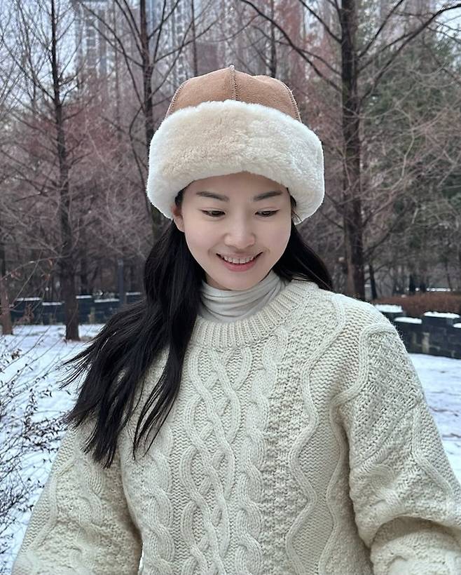 그룹 신화 전진의 아내 류이서가 편안하게 착용한 털모자와 케이블 니트로 러블리한 산책룩을 연출했다.