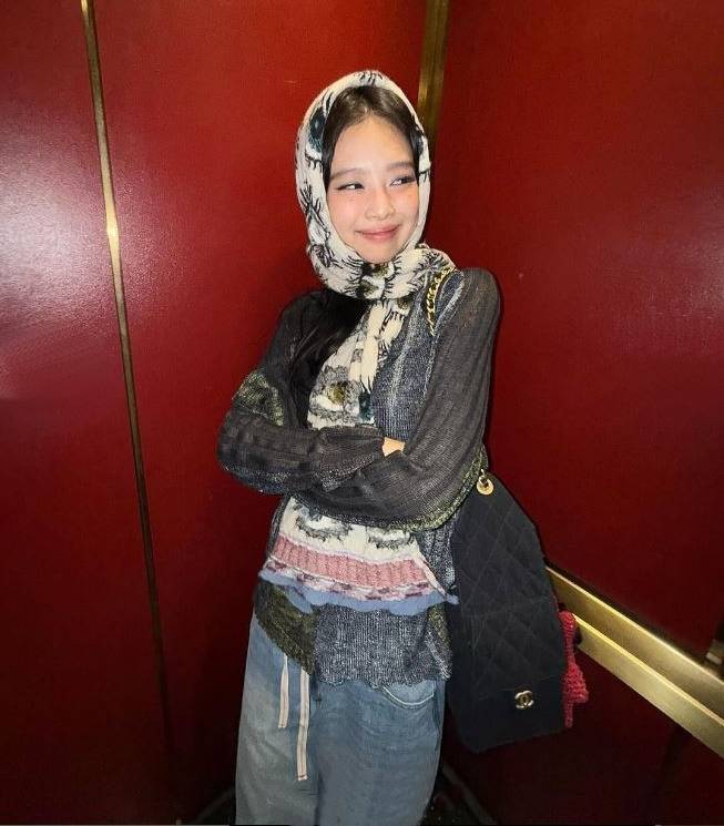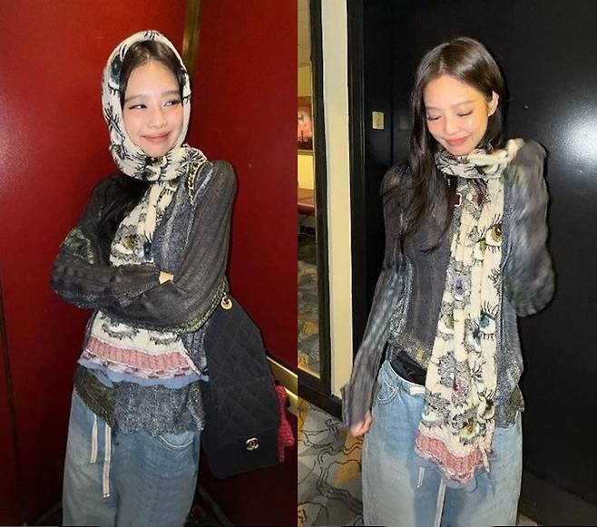 공개된 사진 속 제니는 보헤미안 감성의 니트와 와이드 핏 청바지, 여기에 머플러를 머리에 쓰거나 무심하게 두른 보헤미안 잇걸룩으로 포즈를 취한 모습이다.