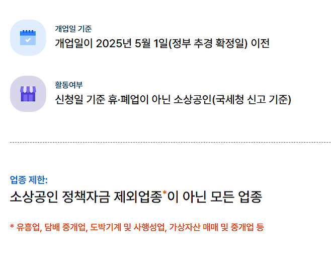 신청일 기준 정상 영업 중인 사업자만 가능합니다. 휴업·폐업 상태거나 실제 영업을 하지 않는 경우는 제외됩니다.