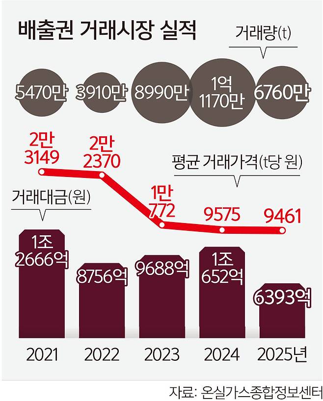 거래량 감소와 함께 거래대금도 축소됐다. 탄소배출권 거래대금은 2024년 1조652억원에서 2025년 6393억원으로 줄며 다시 1조원대가 무너졌다. 1년 만에 약 40.0% 감소했다. 배출권 평균 거래가격도 이산화탄소(CO₂) 1t당 9461원으로, 2024년(9575원)보다 낮아졌다.