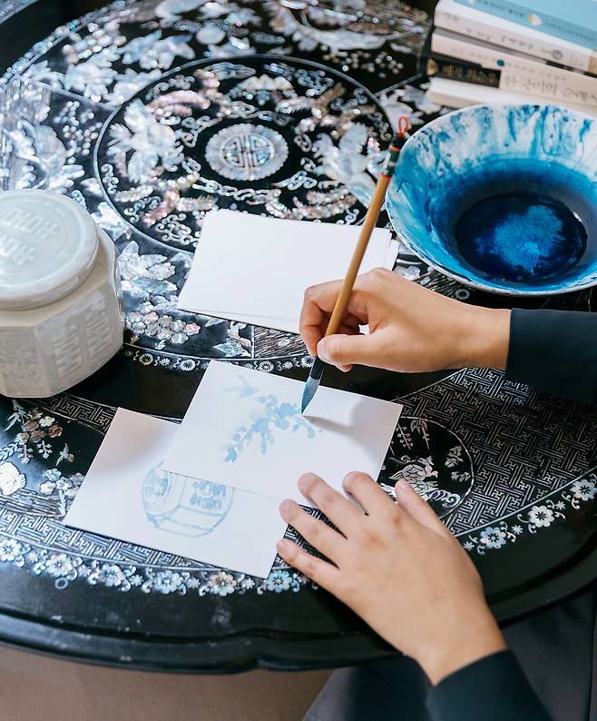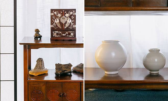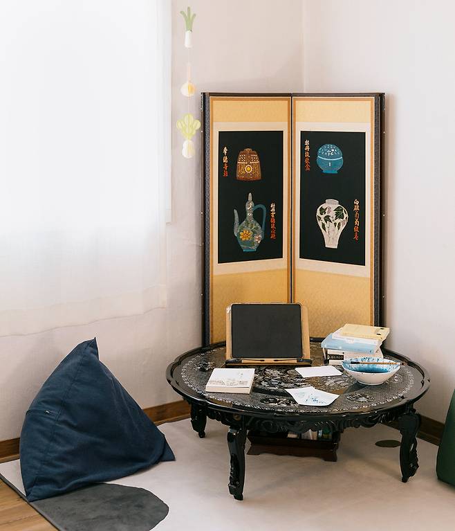 가장 마음에 드는 건 거실이에요. 이 집의 중심 공간이라고 할 수 있죠. 12폭짜리 커다란 책가도 병풍부터 자개장과 상, 3층 찬탁에 진열해 놓은 백자와 수석까지 3년 동안 천천히 채워 온 거예요. 그래서 어느 정도 통일성을 갖추며 예쁘게 꾸밀 수 있었던 것 같아요. 거실 한편에는 파란색 수채 물감으로 직접 그린 그림도 전시해 뒀어요. 언젠가 제가 만든 소품과 그림을 판매하는 쇼룸으로 활용해 보고 싶기도 해요.