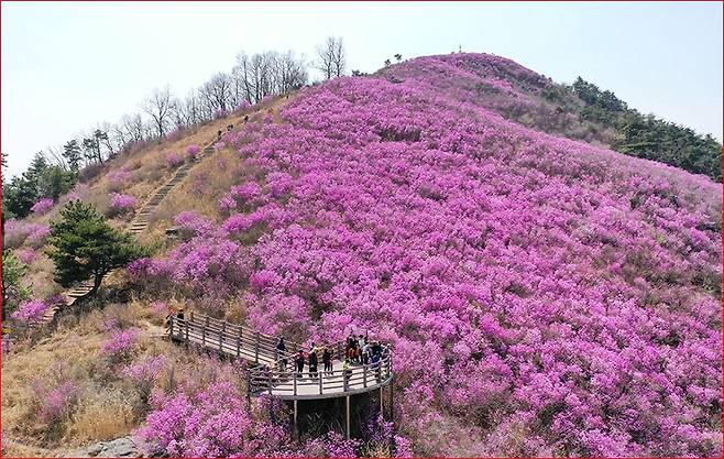 팔각정을 등지고 조금만 이동하면 산행 안내도와 진달래 군락지 안내도가 나오고, 바로 정상으로 이어지는 이정표가 보입니다. 들머리부터 정비가 잘 되어 있어 처음 방문해도 길을 헷갈릴 염려가 거의 없습니다.