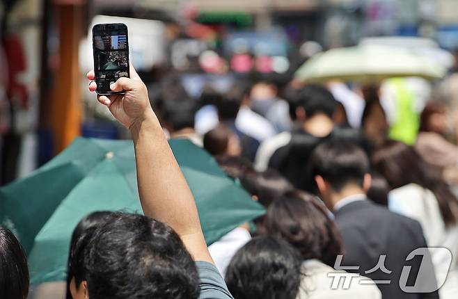 (서울=뉴스1) 오대일 기자 = 제21대 대통령선거 사전투표 첫 날인 29일 서울 중구 소공동주민센터에 마련된 투표소에서 직장인들이 점심시간 투표를 위해 대기하며 길게 늘어선 투표 인파를 스마트폰에 담고 있다.
