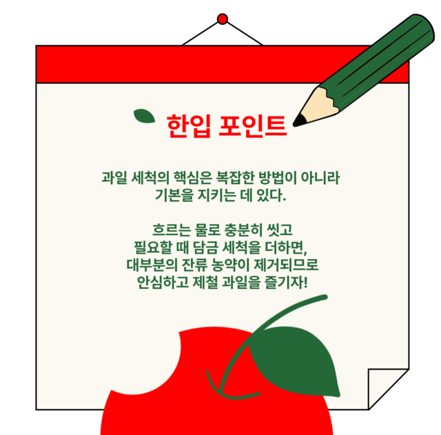 과일 세척은 종류와 섭취 방식에 따라 달라진다. 기본은 흐르는 물로 씻는 것이며, 필요에 따라 담갔다가 헹구거나 껍질을 제거하는 방법을 함께 활용하면 된다.