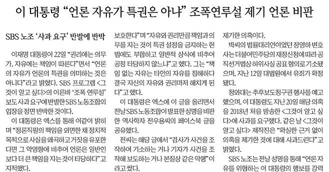 - '그알' 사과받은 이 대통령, SBS노조 반발에 "언론자유 특권 아냐"