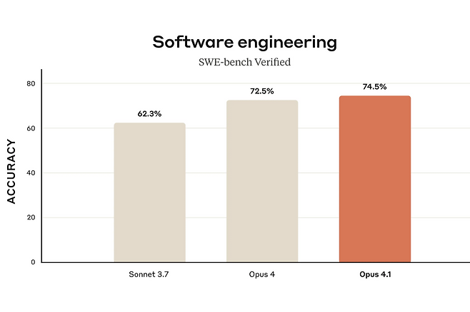 오퍼스 4.1은 SW 문제 해결을 위한 AI 모델 능력을 평가하는 벤치마크인 SWE-벤치 베리파이드(SWE-Bench Verified)에서 74.5%의 점수를 기록했다. 소네트 3.7(62.3%), 오퍼스 4(72.5%) 등 이전 모델을 뛰어넘는 성과를 보였다.