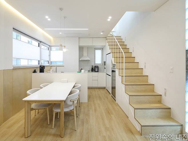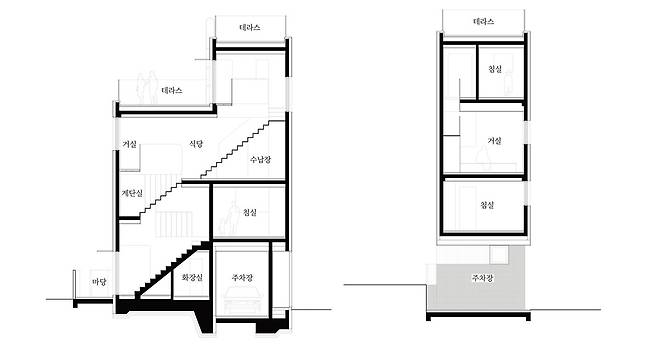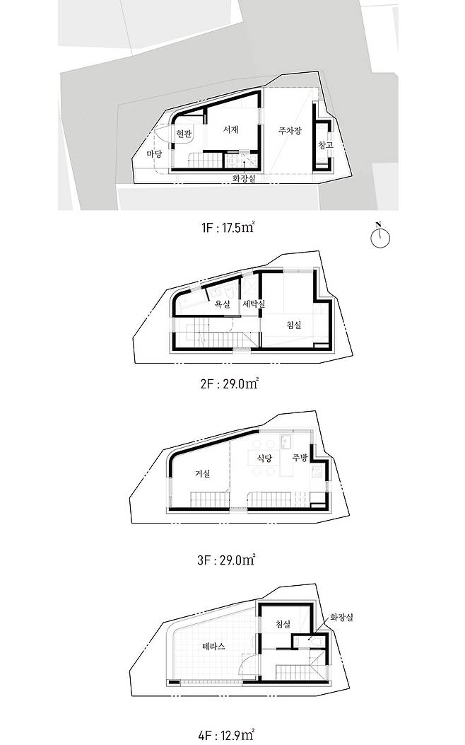 주택은 지상 4층으로 구성되었다. 주 생활 공간인 주방-식당-거실을 3층에 배치하고, 각 침실을 한 층만 오가면 될 수 있게끔 위아래로 배치하고 각각의 층에 욕실을 두었다. 모든 층을 균등한 층고로 두기보다 오랜 시간 머물 3층의 층고를 더 높이고, 자연스럽게 두드러지는 단차를 활용해 거실을 구분했다.