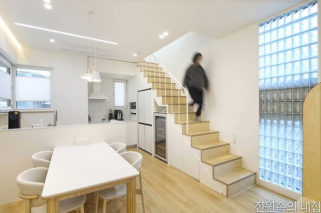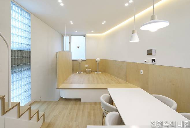 주택이 놓인 땅은 두 갈래로 나뉘는 길모퉁이에 자리했다. 그렇지않아도 좁은 땅이었지만, 도로에 내어줘야 하는 땅으로 인해 면적 확보와 공간 구성이 쉽지 않았다. 주택은 전면이 북쪽으로 놓였고, 남쪽으로는 이웃집과 바로 면해있었다. 그래서 남측으로는 창 안쪽에 유리블록을 더했는데, 덕분에 프라이버시 보호와 채광은 물론 독특한 인테리어 포인트로 기능할 수 있었다. 좁은 면적을 최대한 활용해야 하는 협소주택 특성상 마감재에서도 치장벽돌처럼 부피가 큰 마감재 대신 벽돌타일을 적용했다.