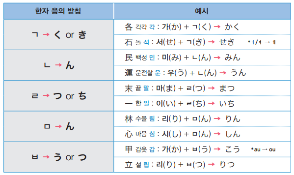 음으로 읽는 한자어인 경우, 한국어와 일본어의 자음과 받침끼리 관련이 있습니다.