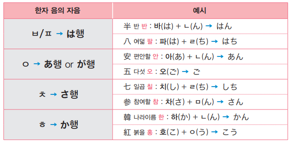 한국식 한자 음의 자음이 'ㅂ' 또는 'ㅍ'일 경우, 일본어의 は행으로 발음됩니다.