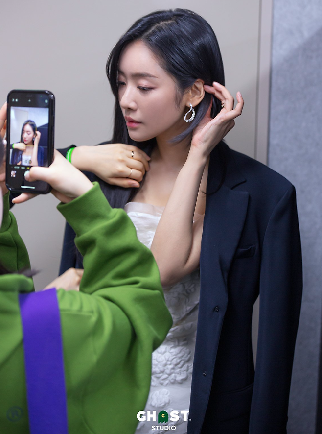 차주영은 화이트 드레스에 검정 자켓을 걸치고 실버 귀걸이로 세련된 스타일링을 완성했습니다.
