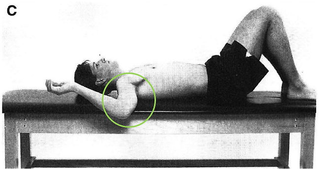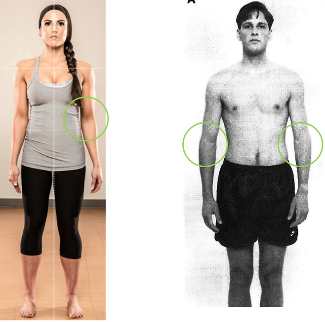 정상의 팔은 가만히 서 있을 때 팔꿈치의 주름이 정면을 향해 있어야 하는데~어떠한 이유로 대원근이 단축이 되었다면 팔이 안쪽으로 돌아가게 되어팔꿈치의 주름이 자신의 몸으로 향하게 되며 팔꿈치가밖을 향해 약간 돌아가는 형태를 가지게 되는 것입니다~