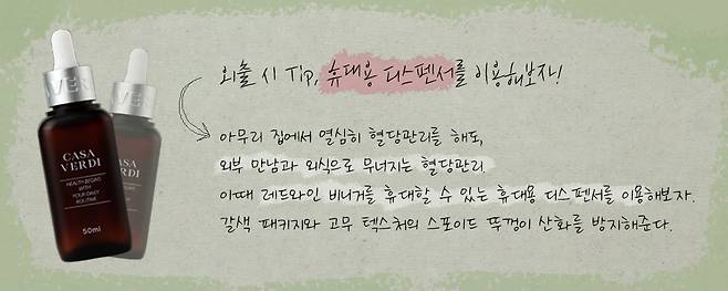 특히 카사베르디 레드와인 비니거는 휴대용 디스펜서가 있어서 외출, 외식 중 언제나 혈당관리와 다이어트 관리가 가능하다.