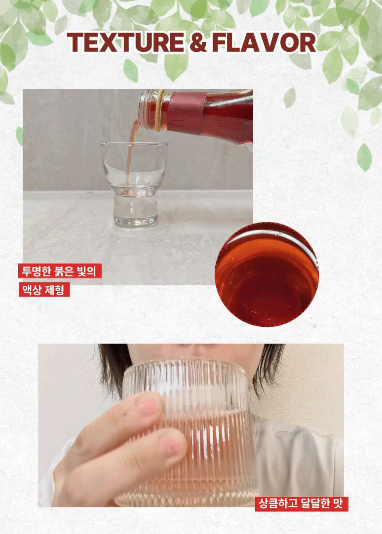 음료수처럼 맑고 투명한 빛깔의 액상 타입이라 먹기 쉽고, 특히 신맛과 단맛/쌉싸름한 맛이 조화롭게 어우러져 입안에 복합적인 풍미를 남기면서도