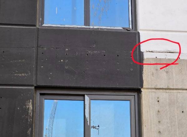 먼저 외관상 새 아파트라고 느껴지지 않을 정도로 외부 마감 수준이 떨어진다고 주장한다. 아파트 외벽에 바른 시멘트를 제대로 그라인딩(갈아내기 작업)하지 않은 채로 페인트를 칠해 새 건물인데도 울퉁불퉁한 ‘곰보 아파트’가 됐다는 것이다. 각 가구 발코니 쪽에 설치한 난간에는 나사가 튀어나와 있고, 콘크리트가 일부 탈락해 금이 간 곳도 적지 않은 것으로 알려졌다.