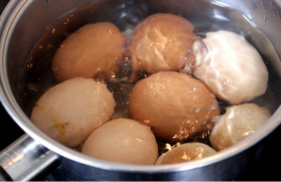 물을 충분히 갈아주며 계란의 열기를 완전히 식힌 뒤, 냄비 안에 물을 아주 조금만 남기고 뚜껑을 닫아 세게 흔들어보세요. 계란끼리 서로 부딪히며 껍질에 미세한 금이 가고, 그 사이로 물이 스며들어 껍질이 거의 저절로 벗겨지는 상태가 됩니다.