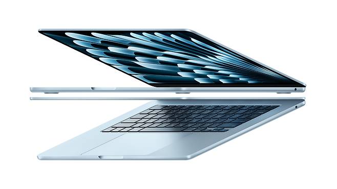 다음 날에는 모두가 기대하고 있던 새로운 맥북 에어가 공개되었습니다. 사실 맥북 에어 역시 달라진 것은 많지 않습니다. 작년 10월에 맥에 처음으로 탑재되기 시작한 M4를 드디어 맥북 에어에서 만나볼 수 있다는 것이 가장 큰 변화겠죠. 맥북 에어에 탑재되는 M4는 10코어 CPU와 최대 10코어 GPU를 선택할 수 있고, 기본 메모리는 16GB부터 시작해서 많은 분들이 메모리를 업그레이드할 필요를 줄일 수 있게 되었어요. 그래도 원한다면 최대 32GB까지 업그레이드할 수 있습니다. M4를 장착한 맥북 에어는 M1 맥북 에어 대비 2배, 마지막 인텔 맥북 에어 대비 23배 더 빠른 속도를 보입니다. M4는 외장 디스플레이 지원도 개선돼서 이제 내장 디스플레이를 연 채로 최대 두 대의 6K 디스플레이를 연결할 수 있습니다. M3에서는 외장 디스플레이 두 대를 사용하고 싶으면 노트북을 닫아야 했죠. 전면 카메라도 1,200만 화소 센서에 초광각 렌즈를 조합해 화상에 등장하는 사람의 얼굴을 추적하는 센터 스테이지를 사용할 수 있습니다.