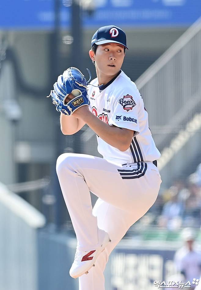 (엑스포츠뉴스 잠실, 박지영 기자) 21일 오후 서울 송파구 잠실야구장에서 열린 '2026 신한 SOL Bank KBO리그 시범경기' KIA 타이거즈와 두산 베어스의 경기, 6회초 두산 최민석이 역투하고 있다.