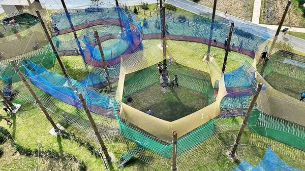 서해 바다가 파노라마로 펼쳐지는 남당항의 언덕 위에는 특별한 야외 어드벤처 시설이 조성되어 있습니다. 촘촘한 네트와 트램폴린 등으로 구성된 남당항 네트 어드벤처가 바로 그 주인공인데요. 색색의 그물네트가 겹겹이 쌓인 모습이 마치 거대한 해양 요새를 연상케 합니다.
