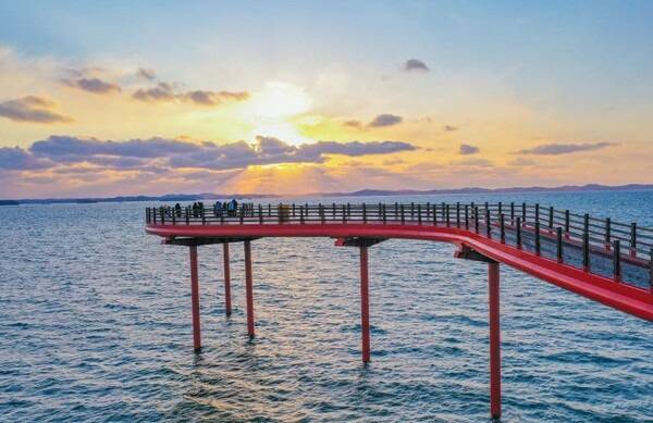 노을이 특히 아름다운 홍성 남당항의 해변에는 높이 13m, 길이 102m의 대형 전망대가 설치되어 있습니다. 붉은 빛의 다리가 홍성의 낙조와 어우러질 때에는 더욱 아름다운 풍경이 펼쳐지는데요.밀물 시기에는 다리 아래로 찰랑이는 서해바다를, 썰물 때에는 다리 아래 반짝이는 갯벌의 숨결을 느낄 수 있습니다.