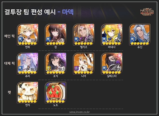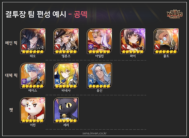 보통 쫄작을 연희와 태오로 진행하니, 이 둘은 장비를 유지해 화력을 살리고 린과 멜키르, 콜트는 속공을 챙겨줍시다. 상위권에 올라가면 제대로 장비를 세팅한 공덱, 마덱, 방덱을 상대하기 어렵겠지만, 결투장 과투자가 부담스럽다면 입문 단계에서 활용하긴 괜찮습니다.